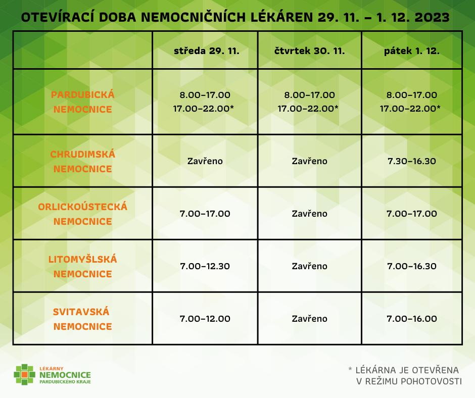Z důvodu pravidelné inventury dojde ve středu 29. a ve čtvrtek 30. listopadu 2023 k omezením provozu čtyř z pěti lékáren Nemocnice Pardubického kraje.