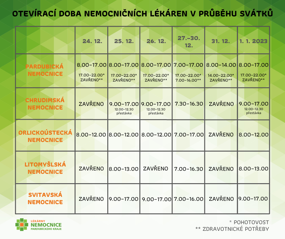 Během následujících vánočních svátků a na přelomu roku 2022/2023 budou mít nemocniční lékárny mírně upravenou otevírací dobu.