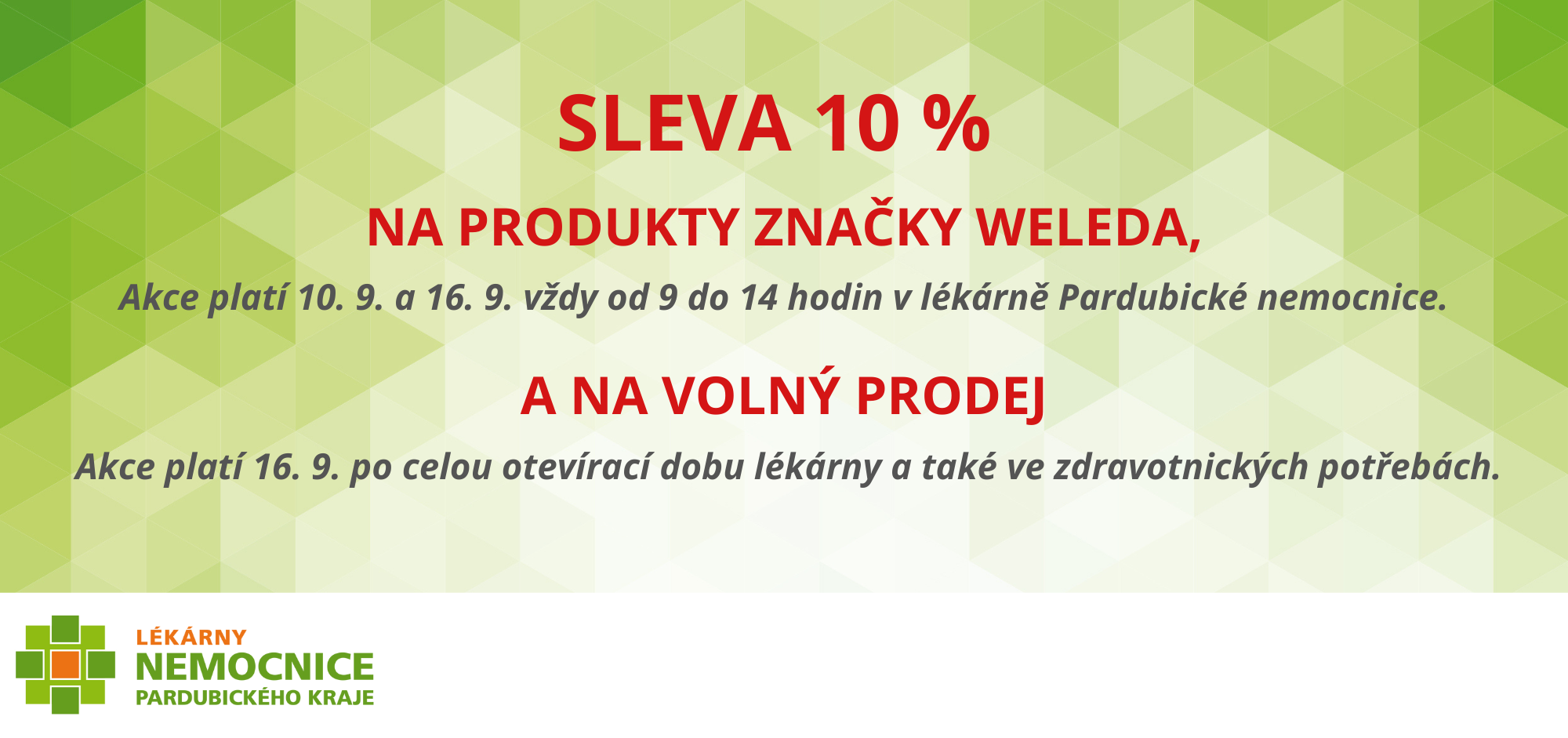 V pátek 10. a ve čtvrtek 16. září budou v lékárně Pardubické nemocnice probíhat slevové akce.
