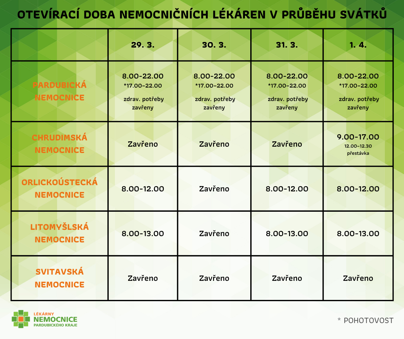Provozní doba lékáren Nemocnice Pardubického kraje o Velikonocích